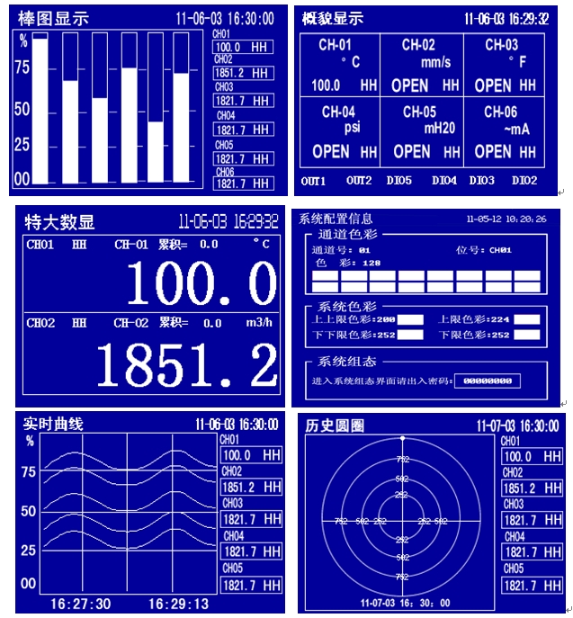 KH300AB智能小型藍(lán)屏無(wú)紙記錄儀(96×96mm最多6通道輸入),為藍(lán)屏液晶顯示。儀表具有全隔離萬(wàn)能輸入功能,可輸入標(biāo)準(zhǔn)電流、標(biāo)準(zhǔn)電壓、毫伏、熱電阻、熱電偶等信號(hào)于一體;可提供通訊、打印、報(bào)警、饋電輸出等功能。儀表具有流量累積、溫壓補(bǔ)償功能;具有強(qiáng)大的顯示功能,高精度棒圖顯示、實(shí)時(shí)中圓圖顯示、歷史圓圖追憶、實(shí)時(shí)曲線顯示、歷史曲線追憶、報(bào)警狀態(tài)顯示,同時(shí)可直接查詢年、月、日、時(shí)、分、秒的數(shù)據(jù),快捷方便,頁(yè)面刷新速度小于1秒。使用RS485、RS232通訊,標(biāo)準(zhǔn)MODBUS-RTU協(xié)議,可與組態(tài)王、MCGS等專業(yè)軟件進(jìn)行組態(tài);數(shù)據(jù)可直接通過(guò)任意U盤導(dǎo)出,U盤即插即讀,無(wú)需任何操作;分析軟件可導(dǎo)出EXCEL數(shù)據(jù)格式或曲線格式,直接打印即可。