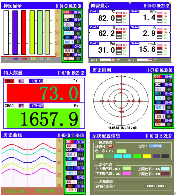 KH300AG智能小型彩色無紙記錄儀(96×96mm最多6通道輸入)具有全隔離萬能輸入功能,集熱電偶信號、熱電阻信號、標(biāo)準(zhǔn)電壓、標(biāo)準(zhǔn)電流、脈沖信號于一體?商峁┩ㄓ崱⒋蛴、報(bào)警、饋電等功能。儀表具有強(qiáng)大的顯示功能,高精度棒圖顯示、實(shí)時(shí)曲線顯示、歷史曲線追憶、中圓圖顯示、歷史圓圖追憶、報(bào)警狀態(tài)顯示,同時(shí)可直接查詢年、月、日、時(shí)、分、秒的數(shù)據(jù),快捷方便,頁面刷新速度小于1秒。使用RS232/485通訊,標(biāo)準(zhǔn)MODBUS-RTU協(xié)議,可與組態(tài)王、MCGS等專業(yè)軟件進(jìn)行組態(tài)。數(shù)據(jù)可直接通過任意U盤導(dǎo)出,U盤即插即讀,無需任何操作;分析軟件可導(dǎo)出EXCEL數(shù)據(jù)格式或曲線格式,直接打印即可,兩者同時(shí)使用或兩者選其一。